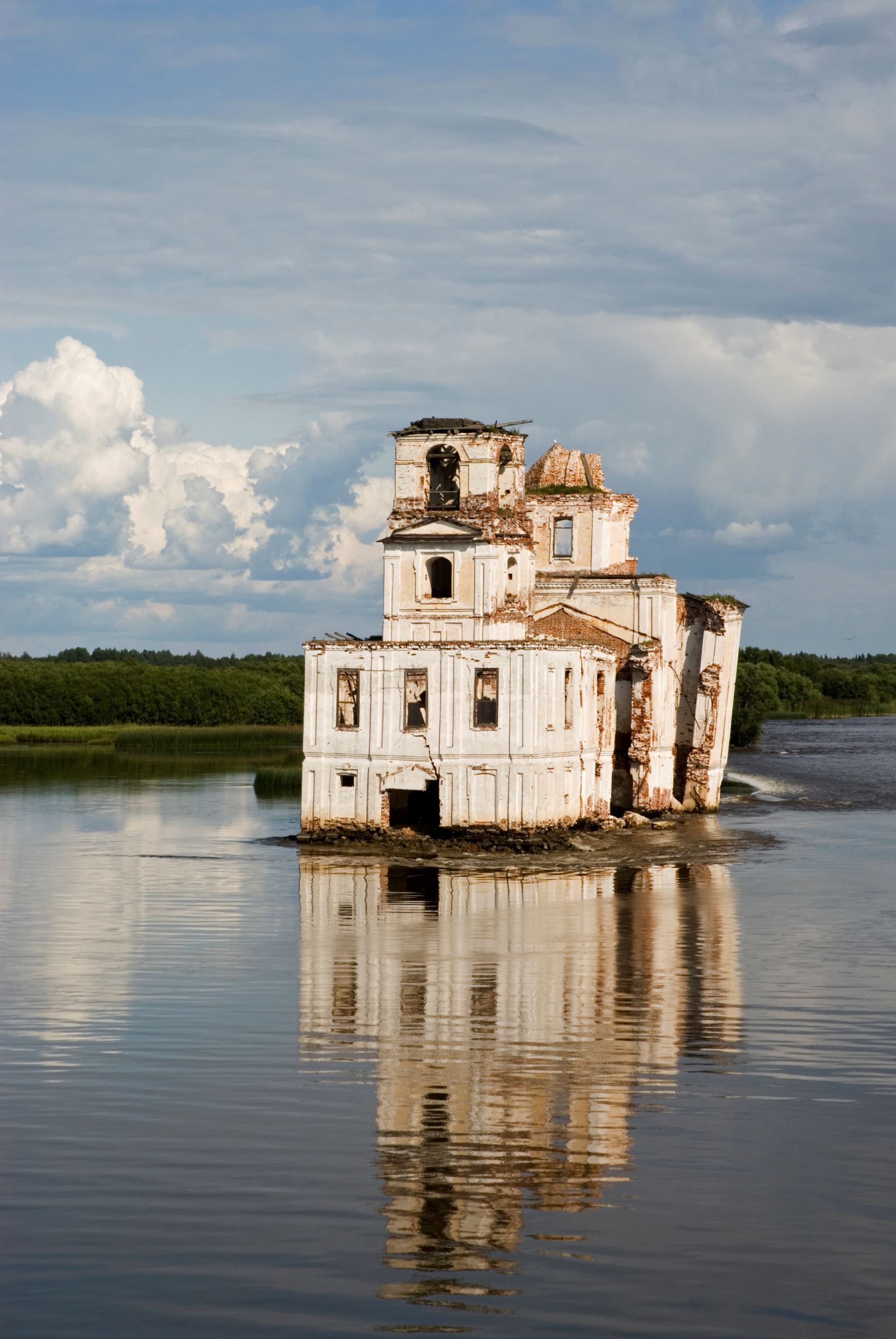 In the 1960s, the water level in the Sheksna River was artificially raised during the construction of Volga-Baltic Waterway. The village of Krokhino, on the river bank, was submerged, leaving only the Nativity Church out of water.