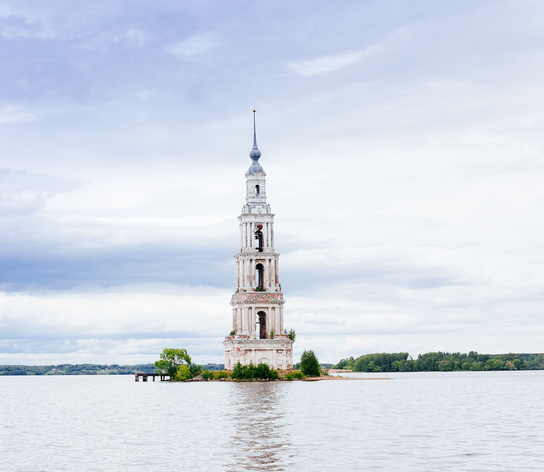 The construction of the Uglich Reservoir on the Volga River in 1939 swamped the town of Kalyazin and several buildings were dismantled. However, the bell tower of the cathedral still stands as a relic of the past.