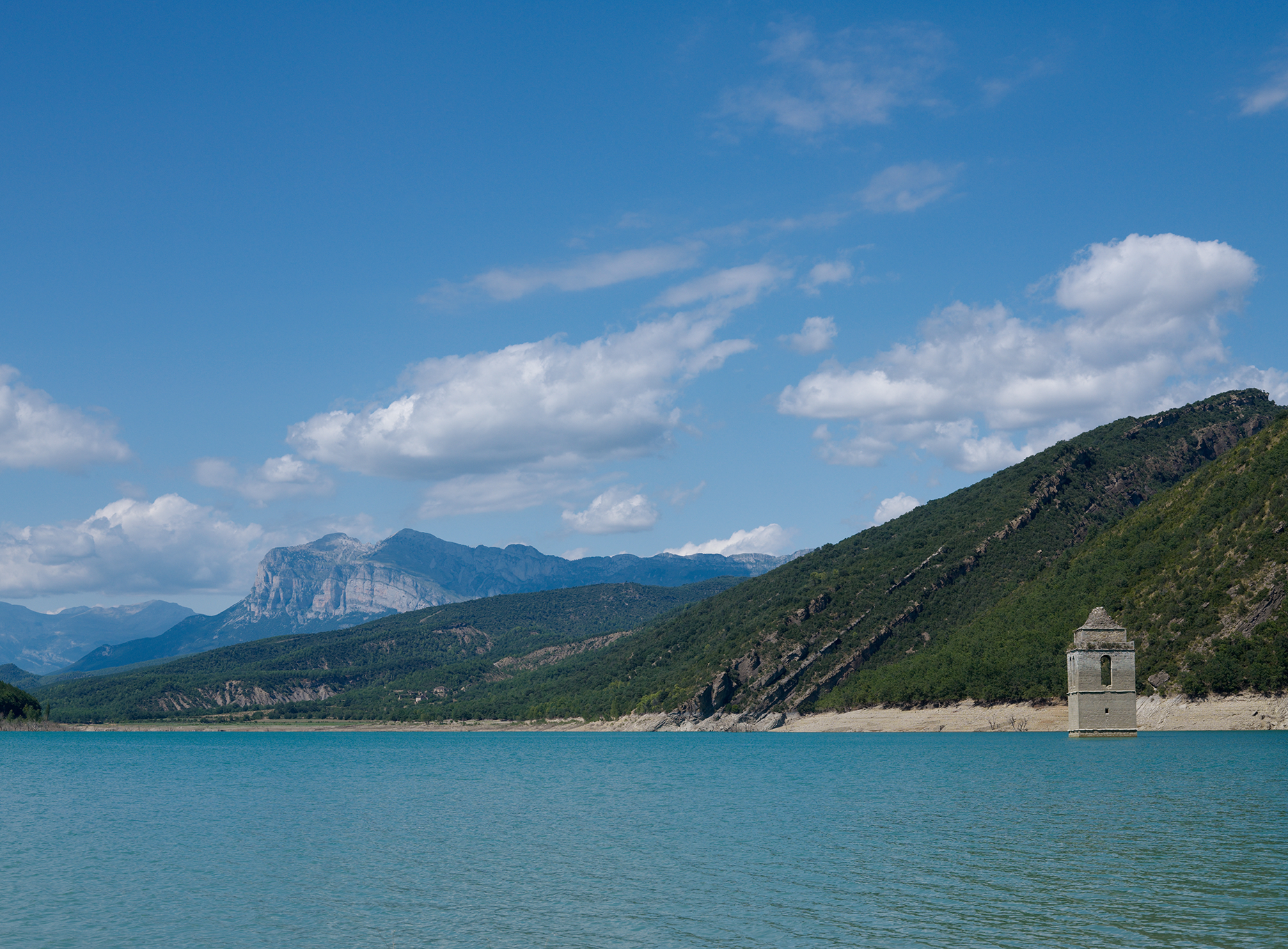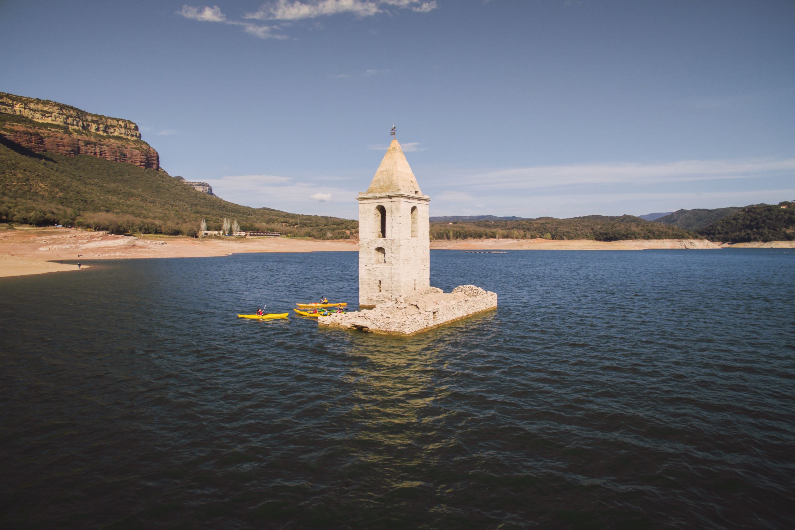 The church and the village of Sant Roma de Sau went underwater with the construction of Sau reservoir in the 1960s. The ruins of the three-story church along with the rest of the town can be seen during drought when the water level recedes.